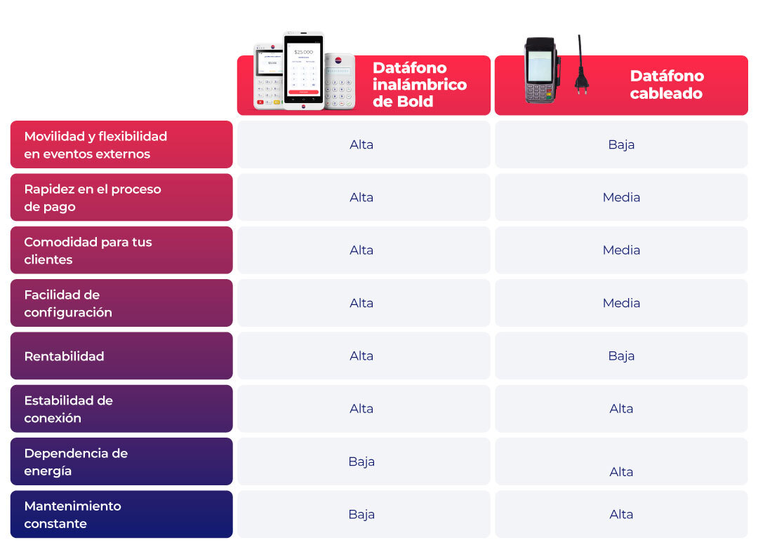Más rentable: Dado que los datáfonos inalámbricos no requieren ninguna conexión física, pueden ser una opción rentable para las empresas que no tienen una ubicación fija. Tampoco requieren gastos de mantenimiento o instalación. Además, en el caso de los datáfonos Bold no deberás pagar ningún gasto de alquiler porque una vez haces el pago inicial el dispositivo es 100% tuyo.